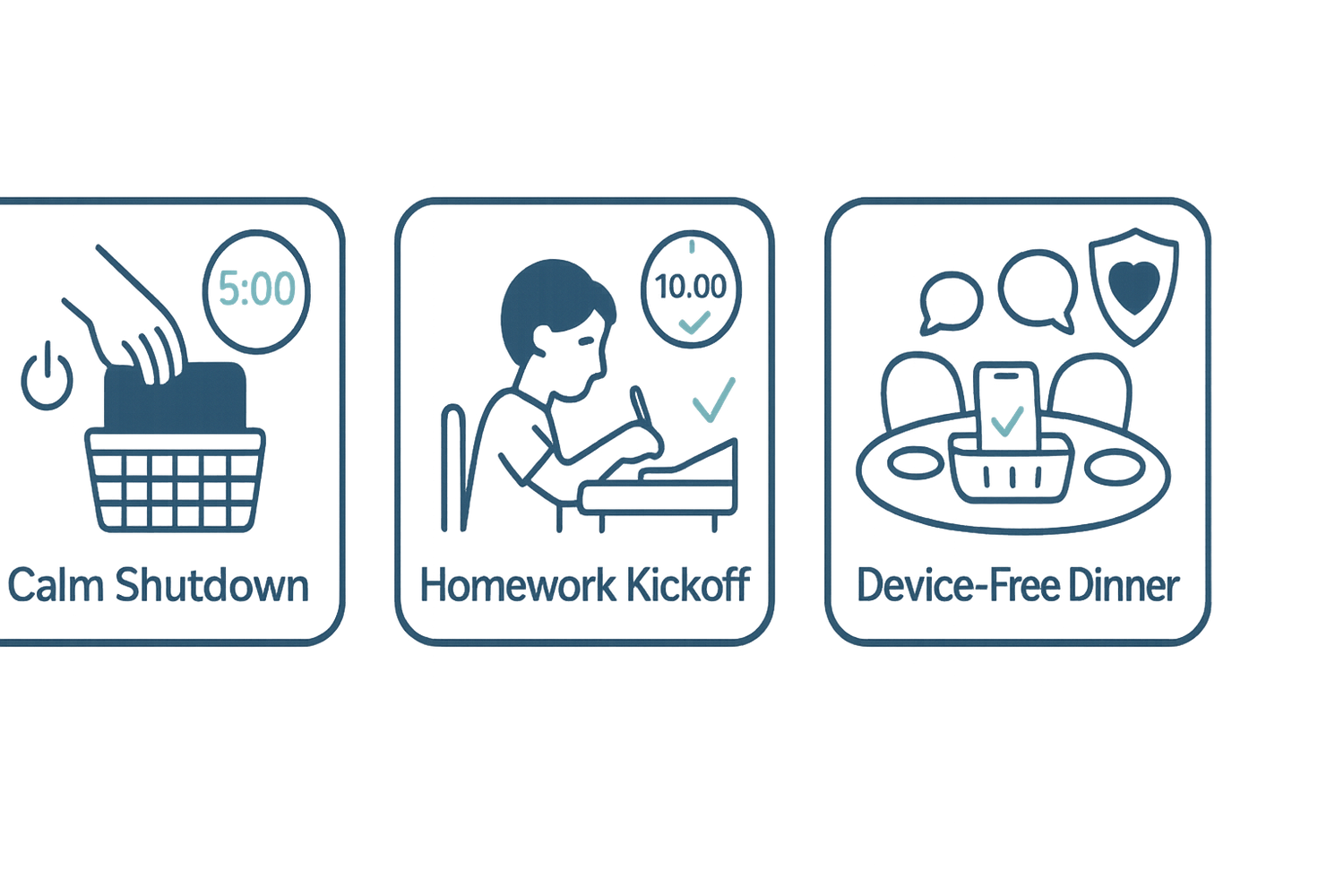 - Daily rhythm: calm shutdown → homework kickoff → device-free dinner → wind-down.